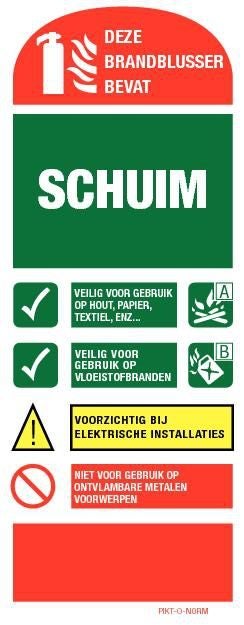 Brandklassen worden met pictogrammen en de desbetreffende letter op brandblussers weergegeven. De blussende werking van schuim is afdekking van de brandende vaste of vloeistof om deze zodoende af te sluiten voor zuurstof. Op deze wijze ontstaat er een tekort aan zuurstof in de brandhaard. Zonder voldoende zuurstof kan een brand niet meer voortduren. Een tweede blussende werking van het blusschuim is dat sterke temperatuurdaling plaatsvindt. Bepaalde schuimblussers zijn behalve op o.a. brandklasse A en B beginbranden eveneens geschikt voor veilig blussen van een elektriciteitsbrand tot 1000 volt. Dit moet wel expliciet op het brandblusser etiket vermeldt worden. Volgens de wet voldoet u met 6-liter-schuimblussers in kantoorpanden of andere bedrijfsmatige toepassingen aan de eisen.